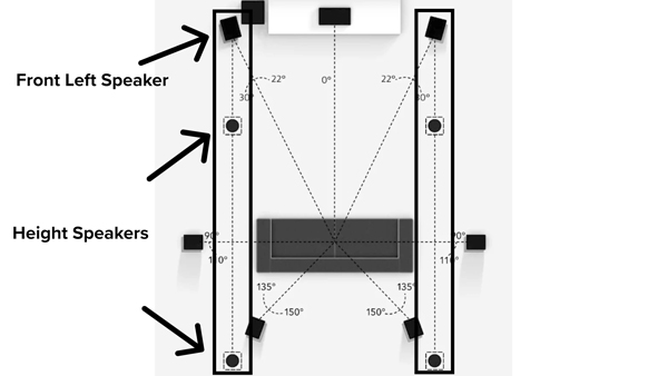 Dolby Atmos height speakers should be placed at angles that direct sound toward the main listening position, accounting for both ceiling height and room width. The exact position varies by room — Dolby's generic diagrams are a starting point, but a room-specific design tool will calculate the precise angles and measurements needed for your space.