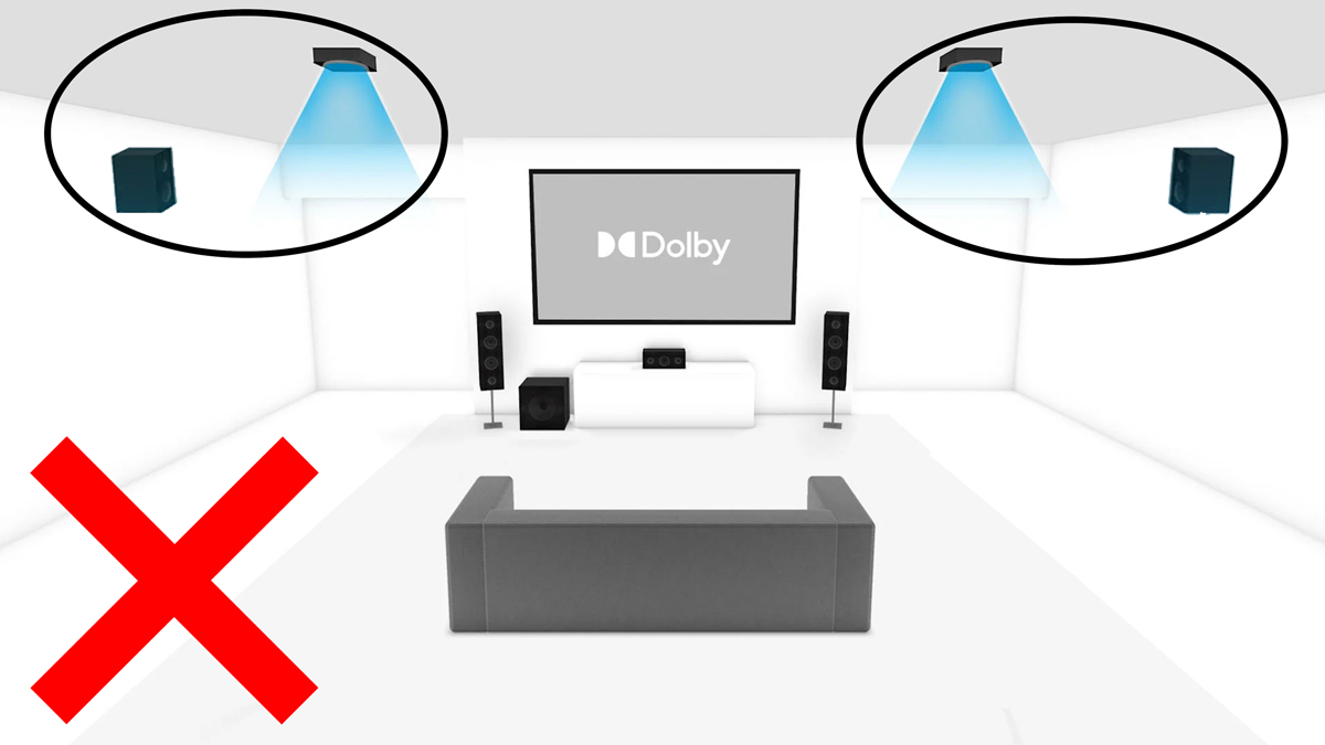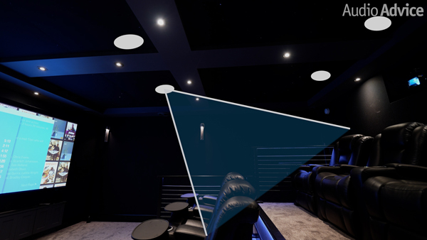Standard in-ceiling speakers are not suitable for Dolby Atmos height channels. They fire straight down toward the floor, so listeners seated several feet away are outside the speaker's optimal listening angle. Atmos height channels require speakers with an angled baffle that can be physically aimed at the seating area.