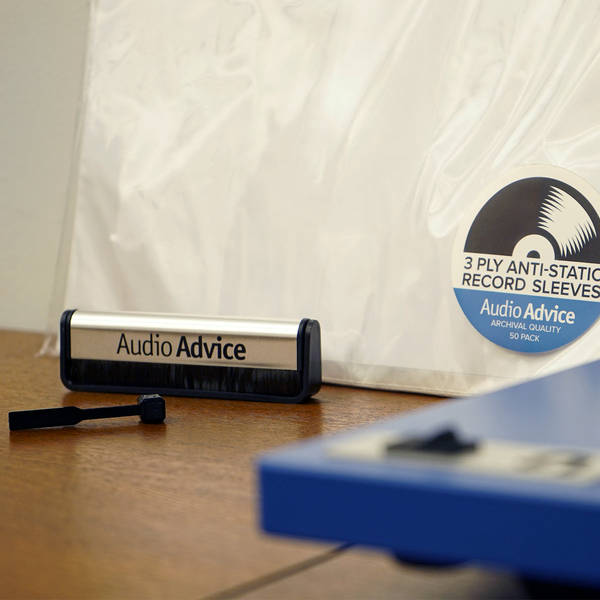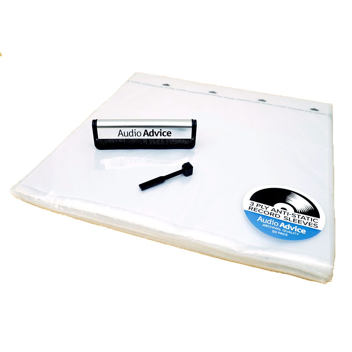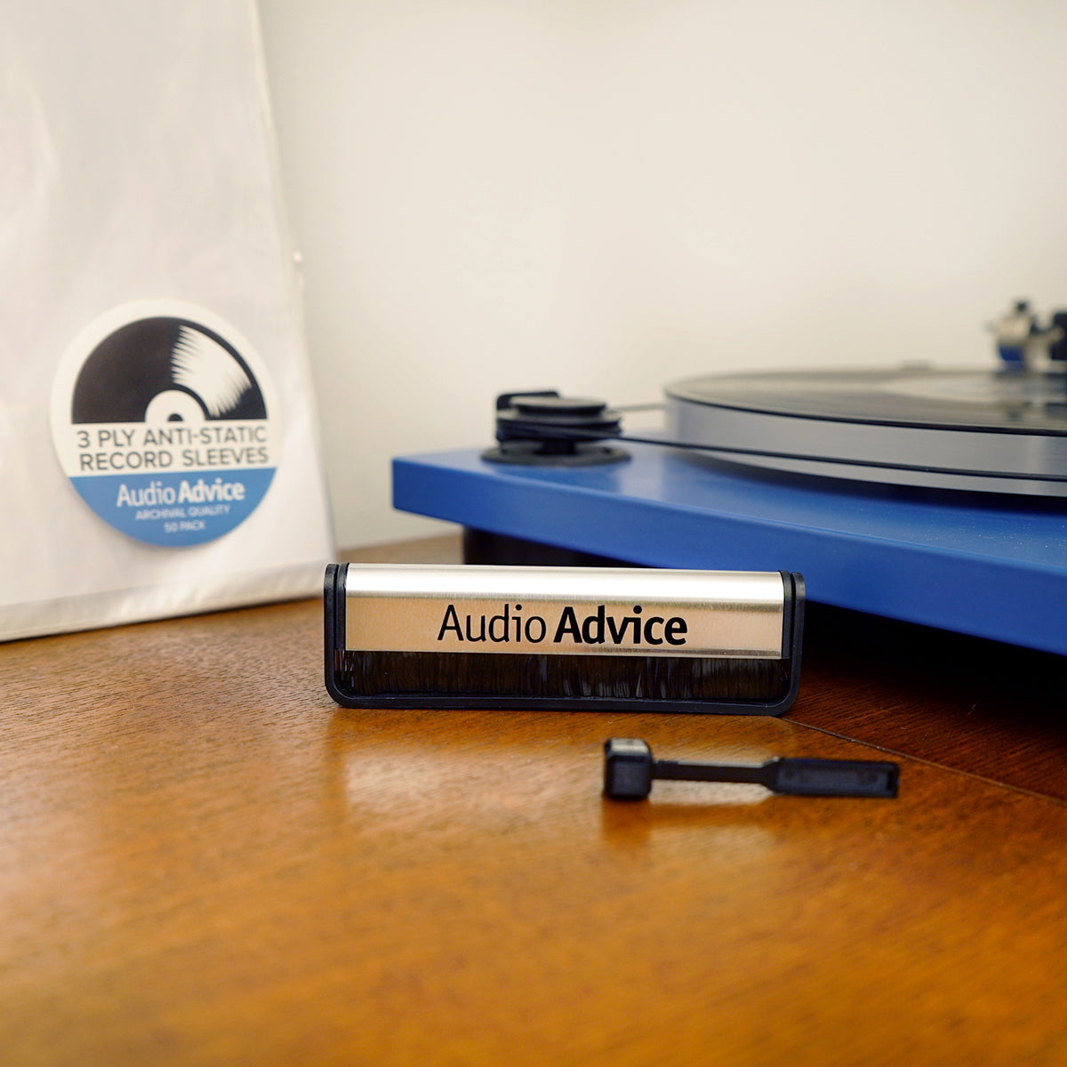 - Audio Advice Anti-Static Record Brush: Our very own Audio Advice anti-static record cleaning brush is designed to swiftly remove debris and dust from your records without leaving a trace behind. Designed with a foldable handle.