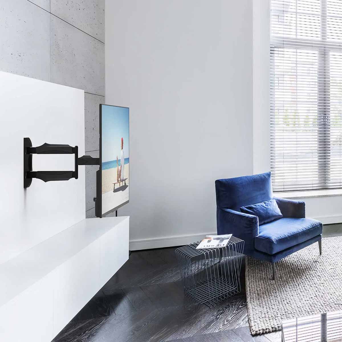 The low-profile design of the M300 allows you to push your TV back to sit 2″ from the wall. (Note: When fully retracted, the center of your TV will sit 5″ to the left or right of where it is mounted)