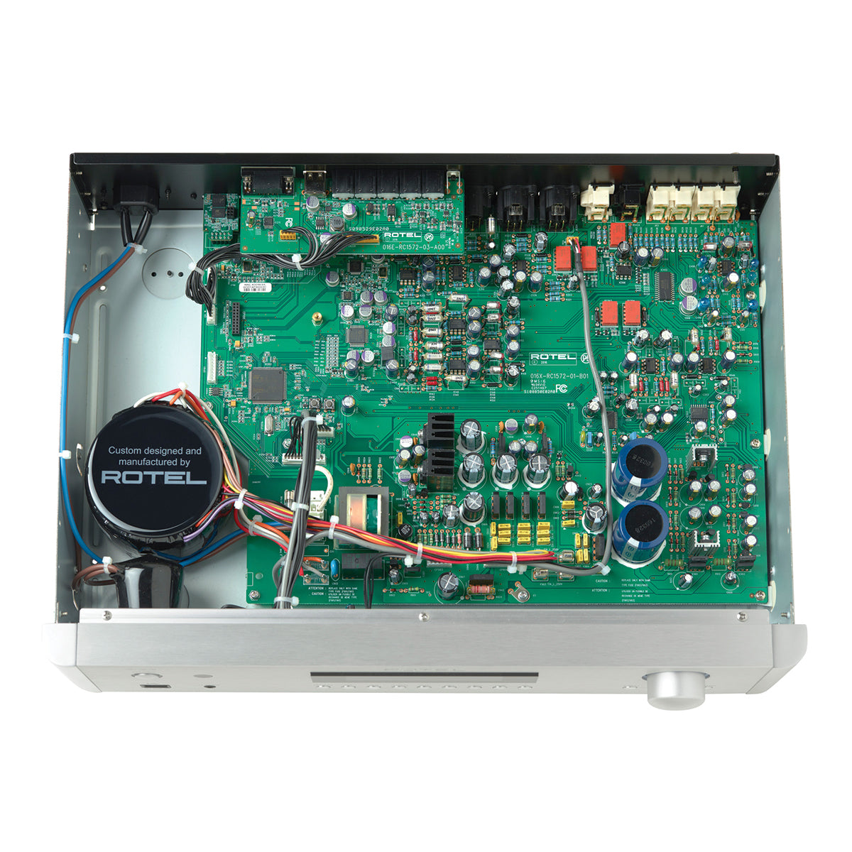 Beneath the clean lines and user friendly fascia of the RC-1572 lies highly sophisticated engineering. Both analog and digital sources have been given equal consideration as today's listener often has several digital sources, but may also enjoy legacy formats like vinyl LPs. A large toroidal transformer and regulated power supply ensures stable current and voltage requirements to all stages under dynamic conditions. Premium circuit components have been selected only after extensive listening evaluations. Careful routing of all low level signals has been practiced to ensure impressive signal to noise levels. The result is effortless musical dynamics, impressive detail and scale.
