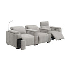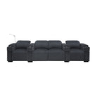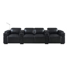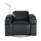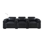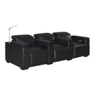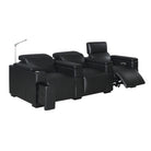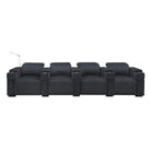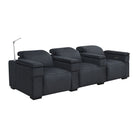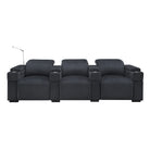 The Calveri comes in black leather, a taupe microfiber fabric, and charcoal microfiber fabric. In a theater setting, black leather is the optimal choice because it will seamlessly blend into the ambient darkness without compromising the viewing experience. The leather is also extremely durable and easy to wipe down if a drink or crumbs get spilled on it. The charcoal fabric option looks cool and can also complement a theater environment due to its dark hue; it's essential to note that maintenance may be a bit more challenging compared to the leather when you or your guest inevitably spills their soda or popcorn on the fabric. But it's dark enough to hide most spills.