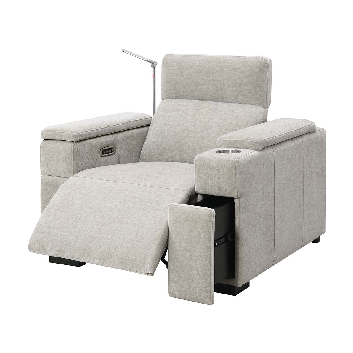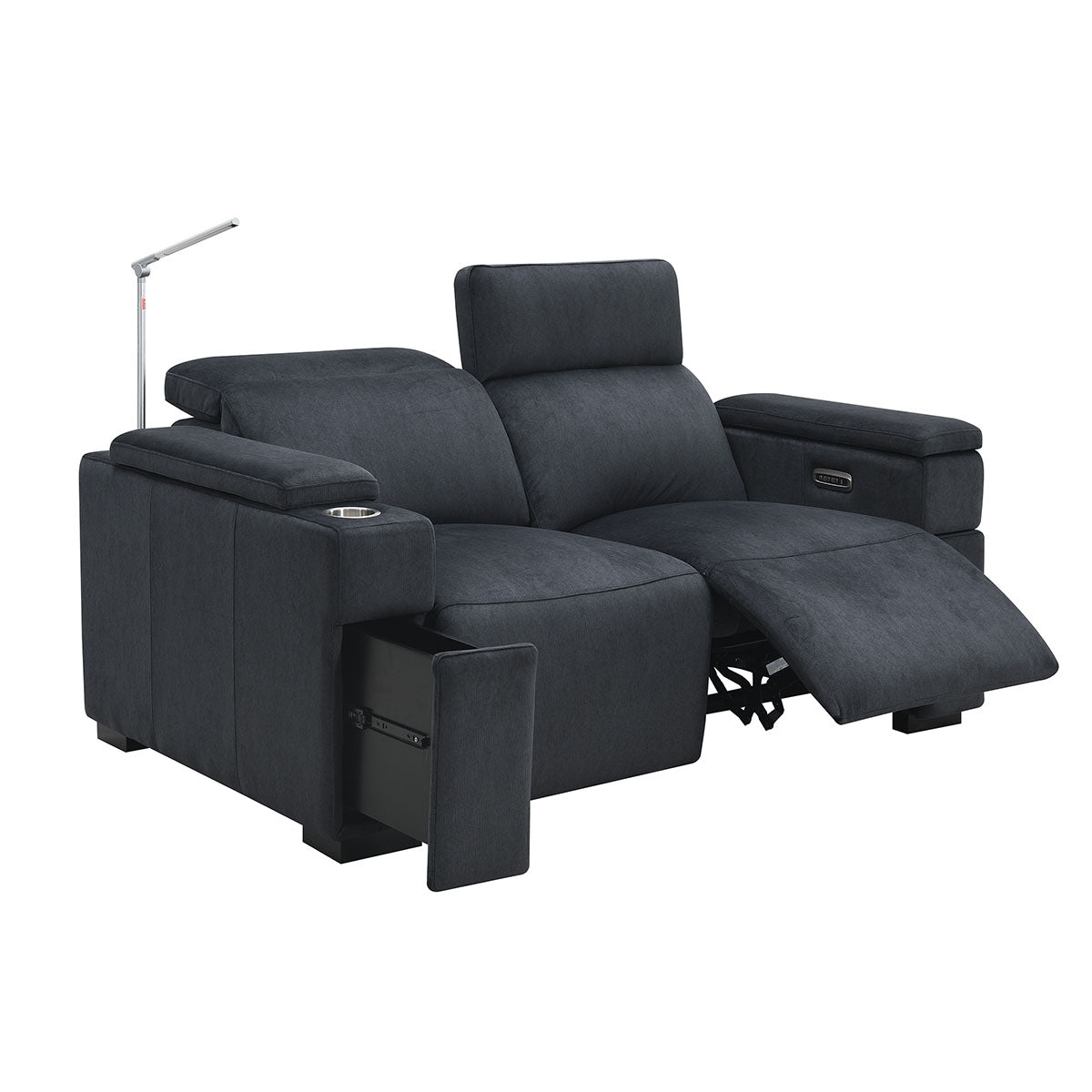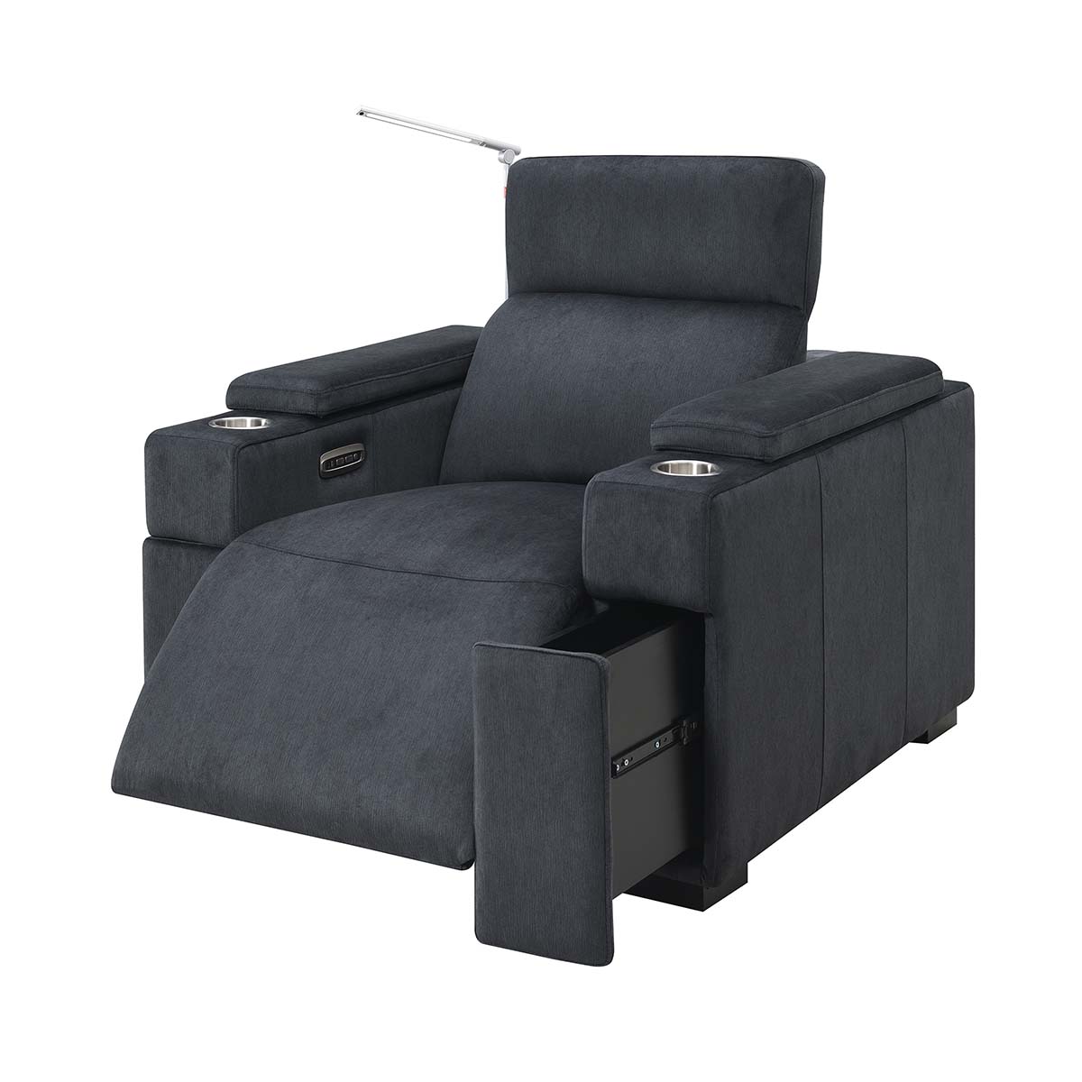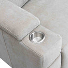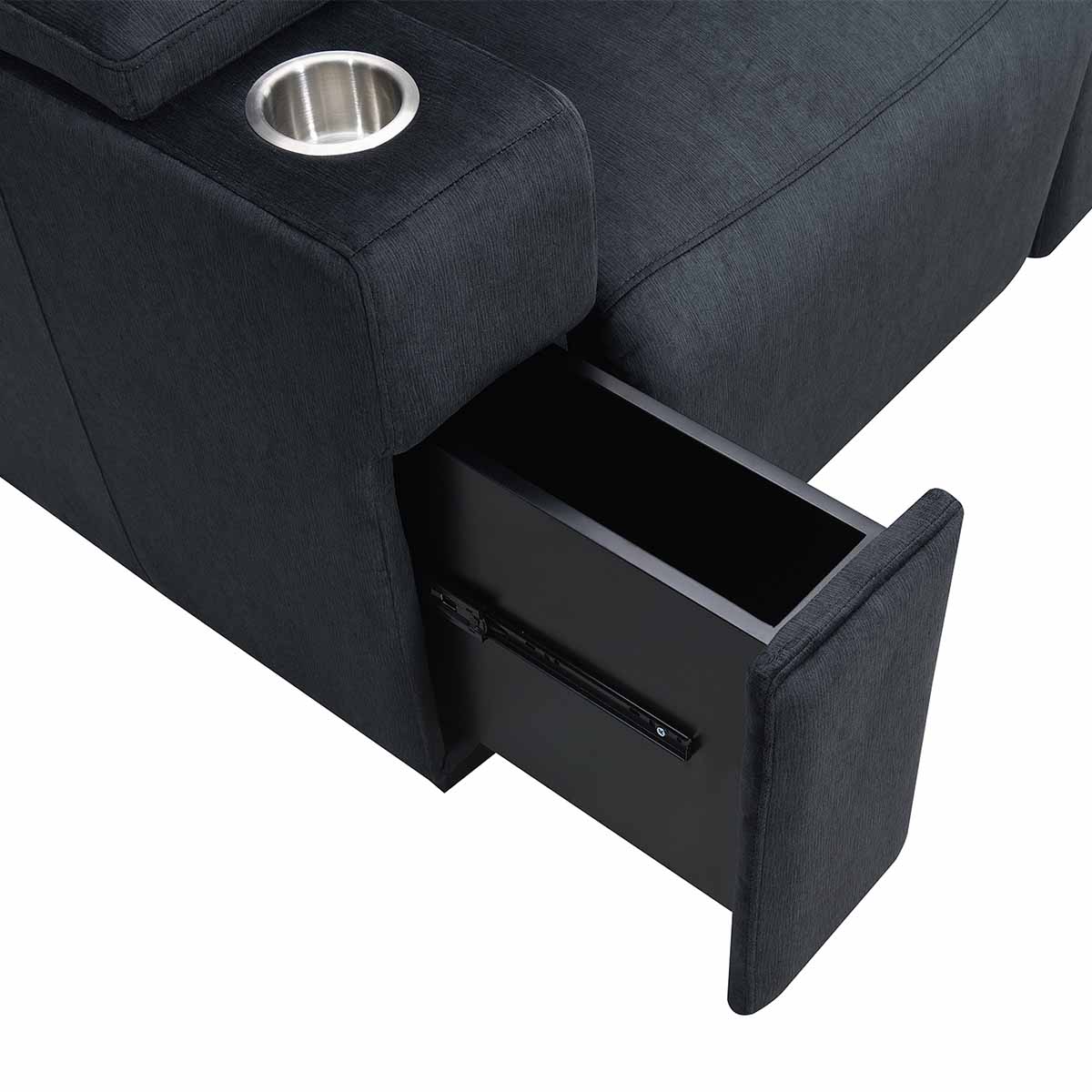 The Calveri also boasts a host of hidden features designed to enhance your experience. Nestled discreetly beneath the armrest, a spacious drawer effortlessly slides out, providing ample storage for remotes, beverages, snacks, cables, and more—keeping everything you need close at hand yet neatly tucked away.