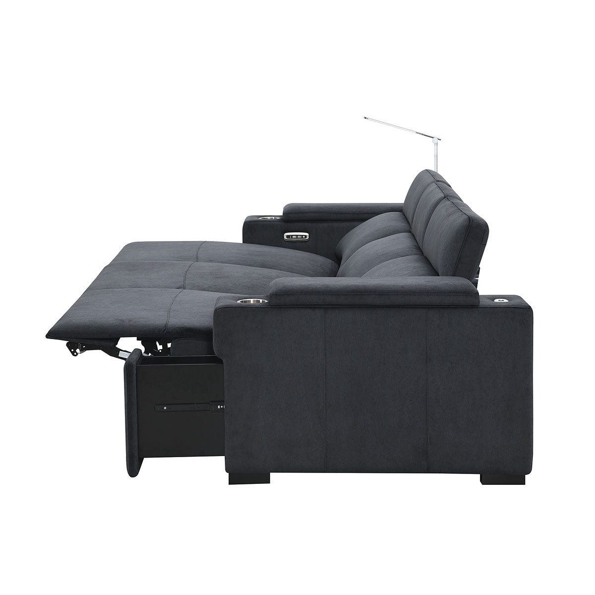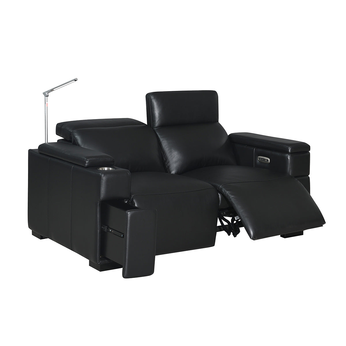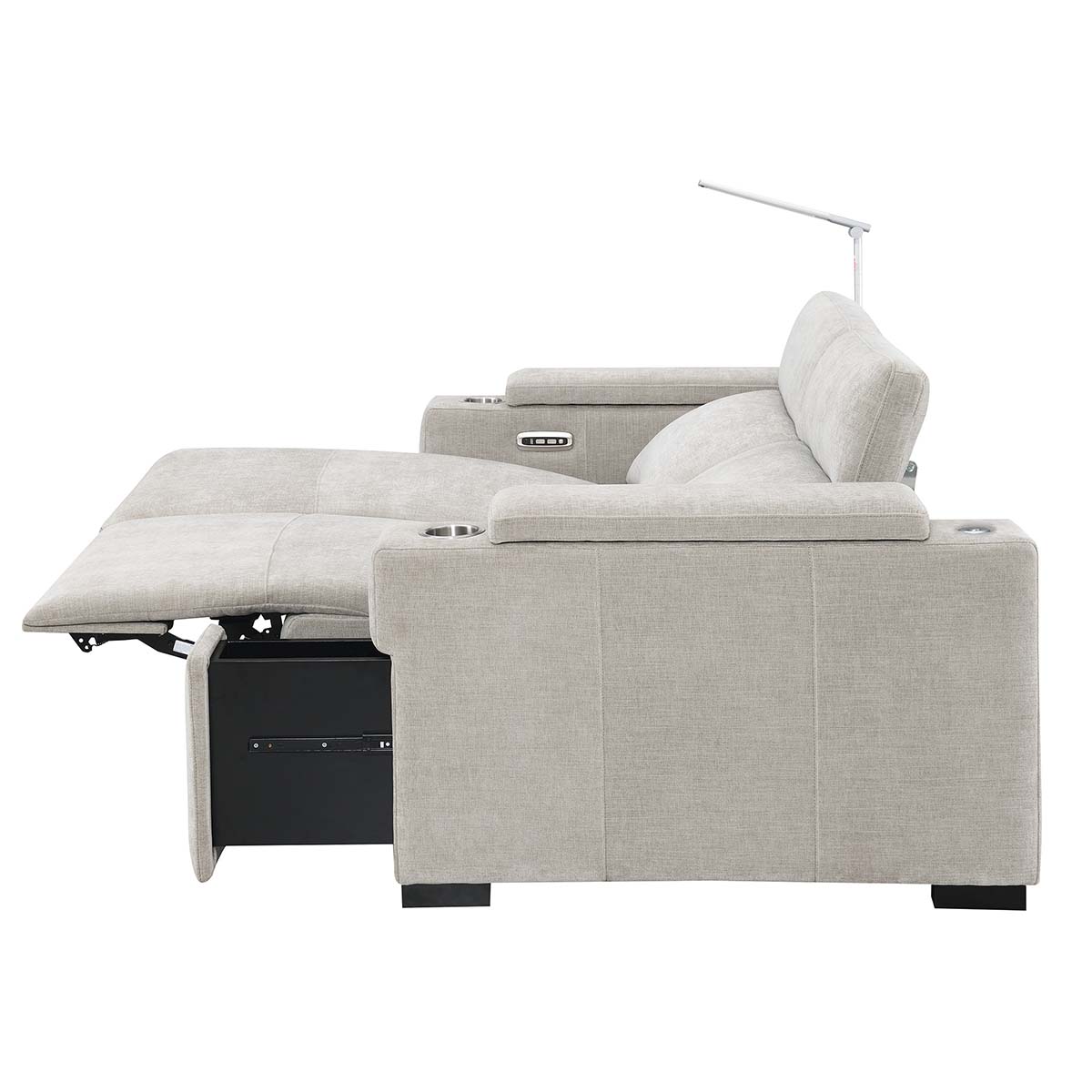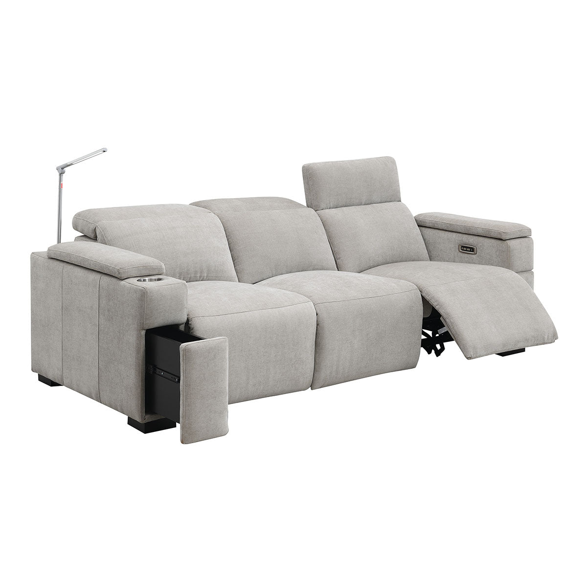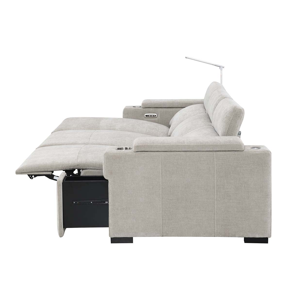 The Calveri also boasts a host of hidden features designed to enhance your experience. Nestled discreetly beneath the armrest, a spacious drawer effortlessly slides out, providing ample storage for remotes, beverages, snacks, cables, and more—keeping everything you need close at hand yet neatly tucked away.