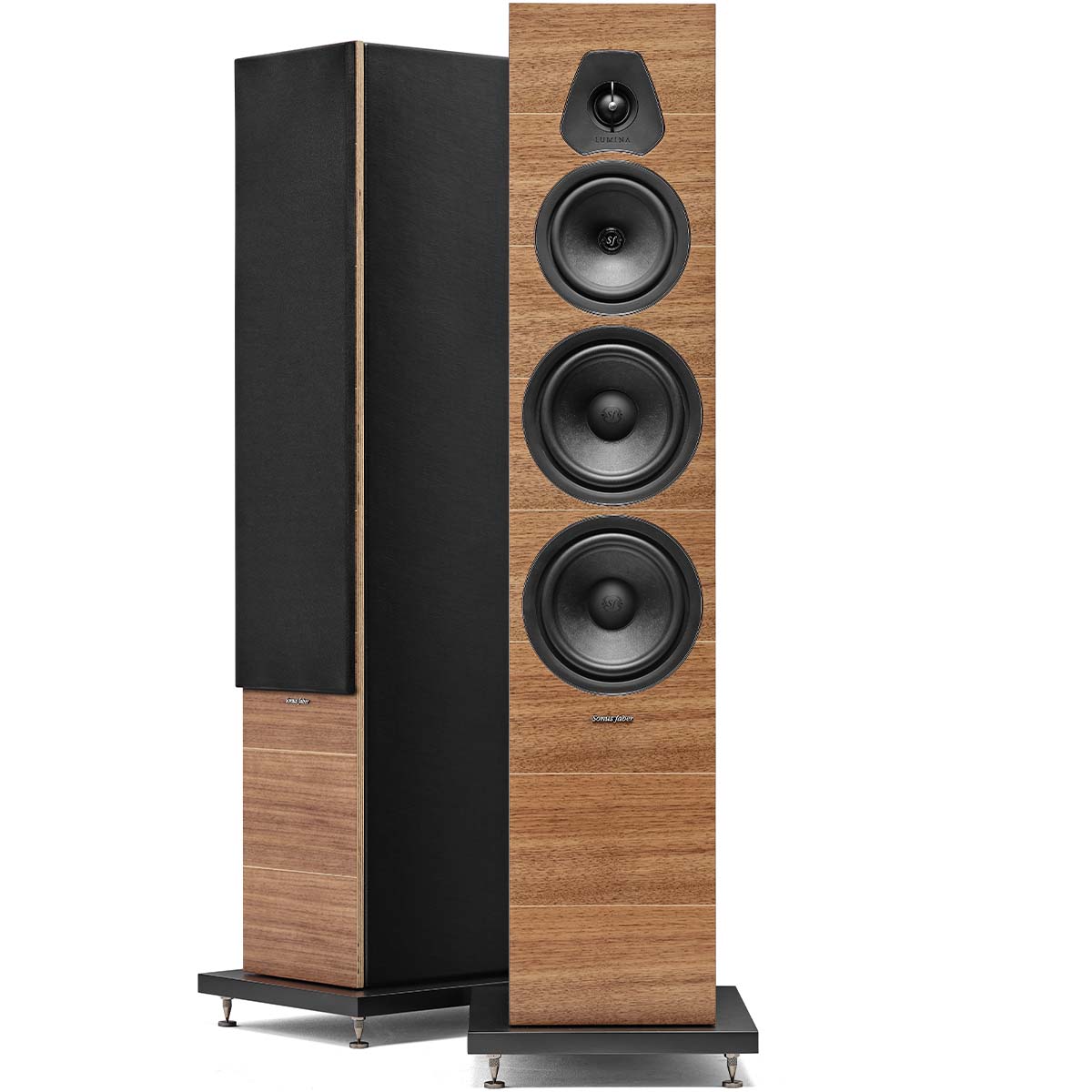 The simple and squared design of the Lumina models was chosen to emphasize the quality of materials used. This principle of minimalism directly captures the essence of this thoughtfully designed product. The Lumina collection boasts the core values of Sonus Faber and the use of its iconic materials, including leather, natural composition of drivers, and real multilayer wood available in Walnut and Wenge wood with Maple inlay matte and Piano Black glossy finishes.